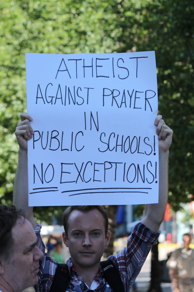 wow. interesting to realize the concept of seperation of church and state now in our current society; its affects. i’ve attended public schools where there are seminaries located on school grounds which churches pay/rent for to allow children to attend some sort of religious education on school grounds but off school time or whathaveyou. it’s great for that particular religion, but who could imagine a seminary for denomination? how do we have publics schools and private belief systems? how do we have a God-less country and Godly children? How can we teach the virtue in diversity when some prayers are okay and some prayers are not?